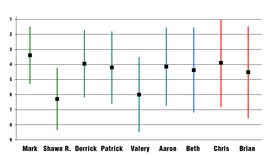 Here’s that same data, in graphical form. The black square is the players average finish. The vertical line shows the range that player tends to finish in. The taller the vertical line, the higher that player’s variance (i.e. the wider their finishing range.)