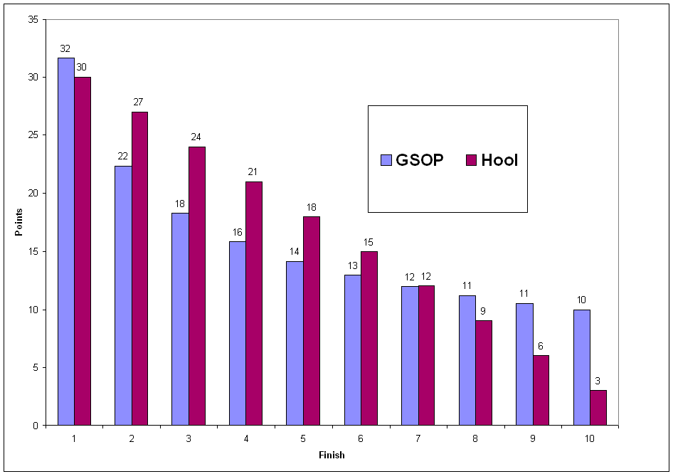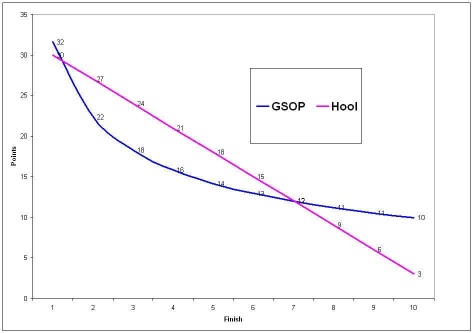 In the Hoolign system, first place awards 10 times as many points as tenth (30 vs 3). In the GSOP system, first place awards about three times as many points as tenth (32 vs 10). However, the GSOP system awards first place 50% more points than second place (32 vs 22), while the Hoolign system awards only 11% more points to first than to second (30 vs 27).