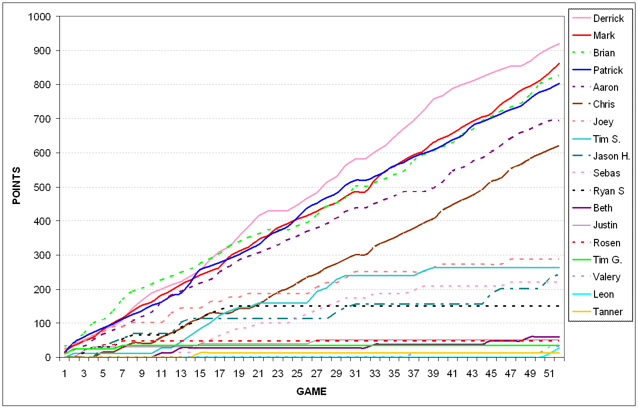 Something similar happens between Aaron and Chris. Aaron averaged sixth place over the course of the year, but won 3 tournaments. Chris had a better average finish – fifth place – but only won a single tournament. Under the Hoolign system, Chris finishes better than Aaron, thanks to his higher average finish, despite winning fewer tournaments.