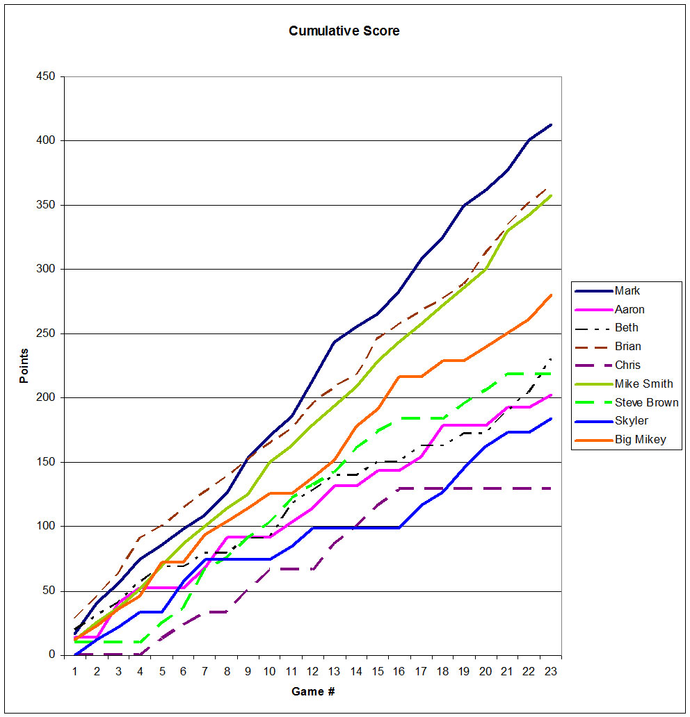 Beth has offered to have us provide a meal for the game at cost. This would no doubt save us a little money and make the pot bigger. Or we can order out for a meal, as we’ve done in previous years.